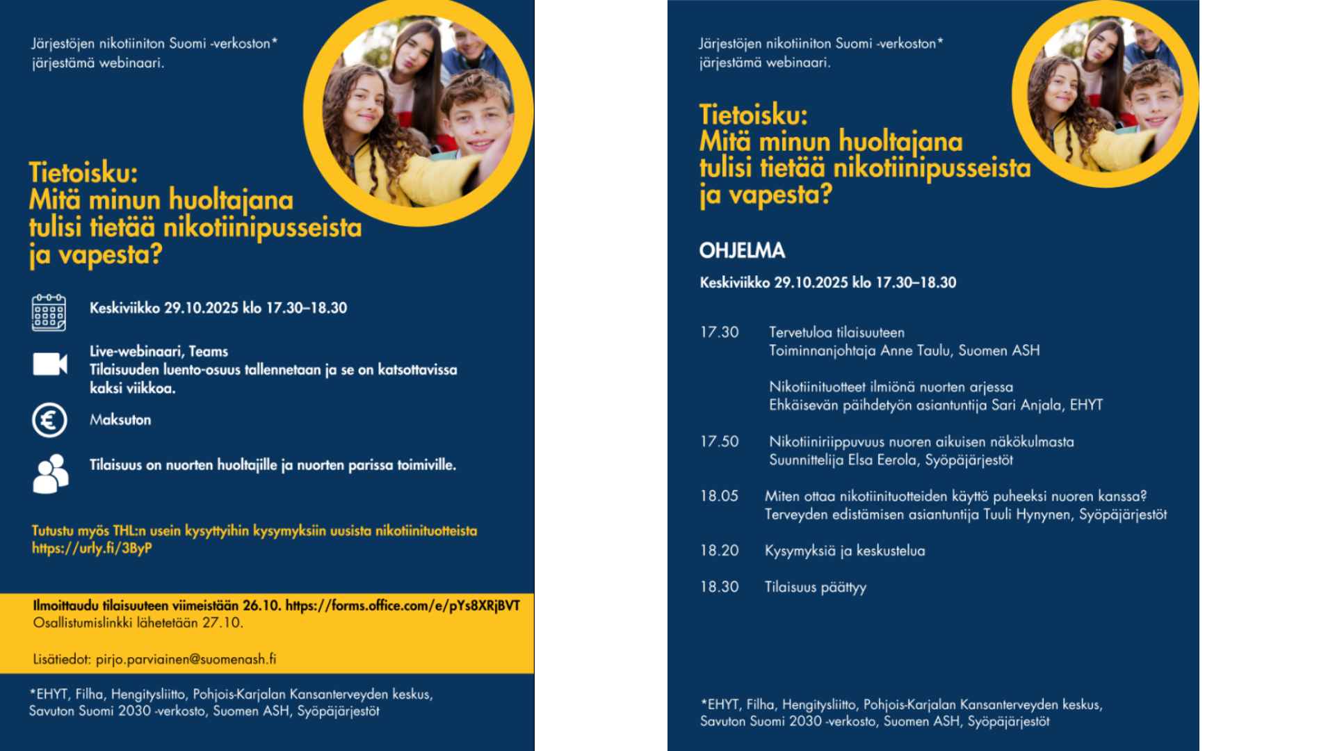 Tervetuloa osallistumaan Nikotiiniton Suomi -verkoston järjestämään webinaariin, jossa saat tietoiskun uusista nikotiinituotteista ja niihin liittyvistä ilmiöistä nuorten elämässä sekä keinoja miten ottaa nikotiinituotteiden käyttö puheeksi nuoren kanssa.